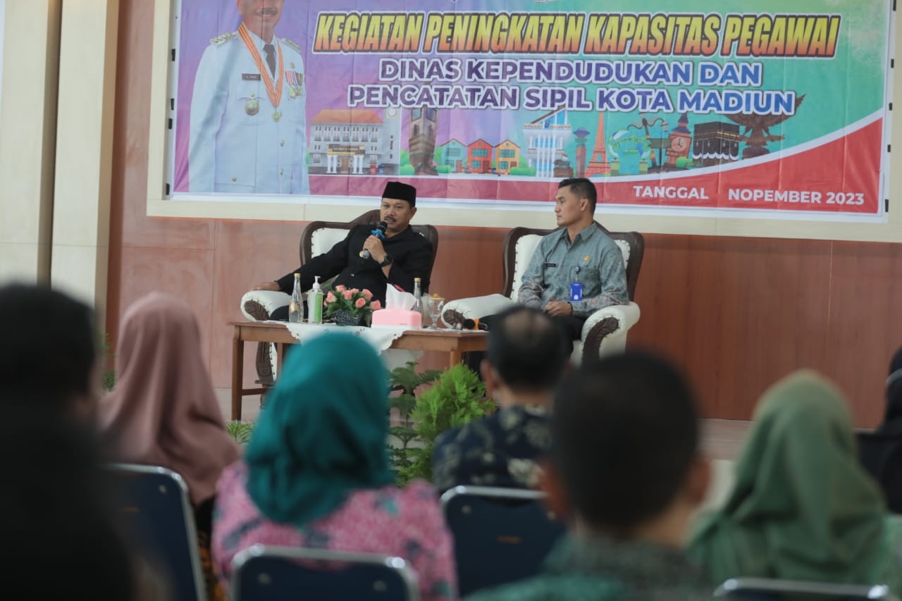 MADIUN – Pelayanan administrasi kependudukan di Kota Madiun kudu prima. Sebab, harus melayani tak mengenal waktu. Pembinaan pegawai pun dilakukan guna peningkatan pelayanan kepada masyarakat tersebut. Wali Kota Madiun, Maidi pun hadir memberikan arahan dalam kegiatan tersebut.