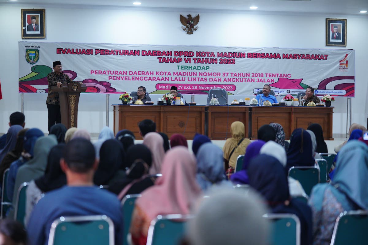 MADIUN - Wali Kota Madiun, Dr.Maidi menghadiri evaluasi peraturan daerah bersama DPRD dan masyarakat. Dalam evaluasi tersebut membahas perda Kota Madiun nomor 37 tahun 2018 tentang penyelenggaraan lalu lintas dan angkutan jalan.