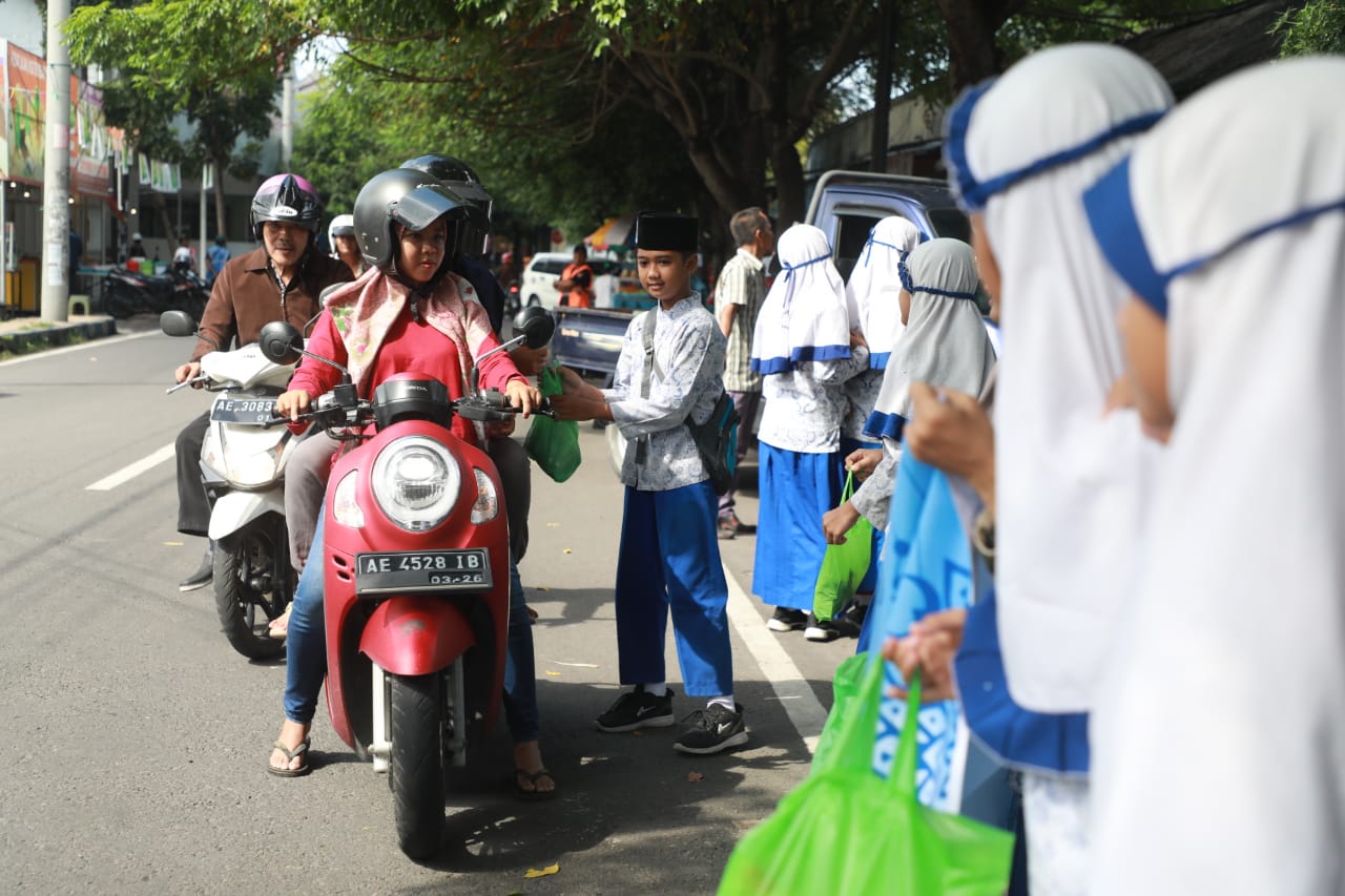 MADIUN - Banyak cara unik yang bisa dilakukan untuk berbagi. Salah satunya yakni seperti yang dilakukan pelajar di Kota Madiun. Mereka berbelanja lalu membagi-bagikan bingkisan sayuran segar pada para pengendara yang melintas di sepanjang Jalan Imam Bonjol, Sabtu (30/3).