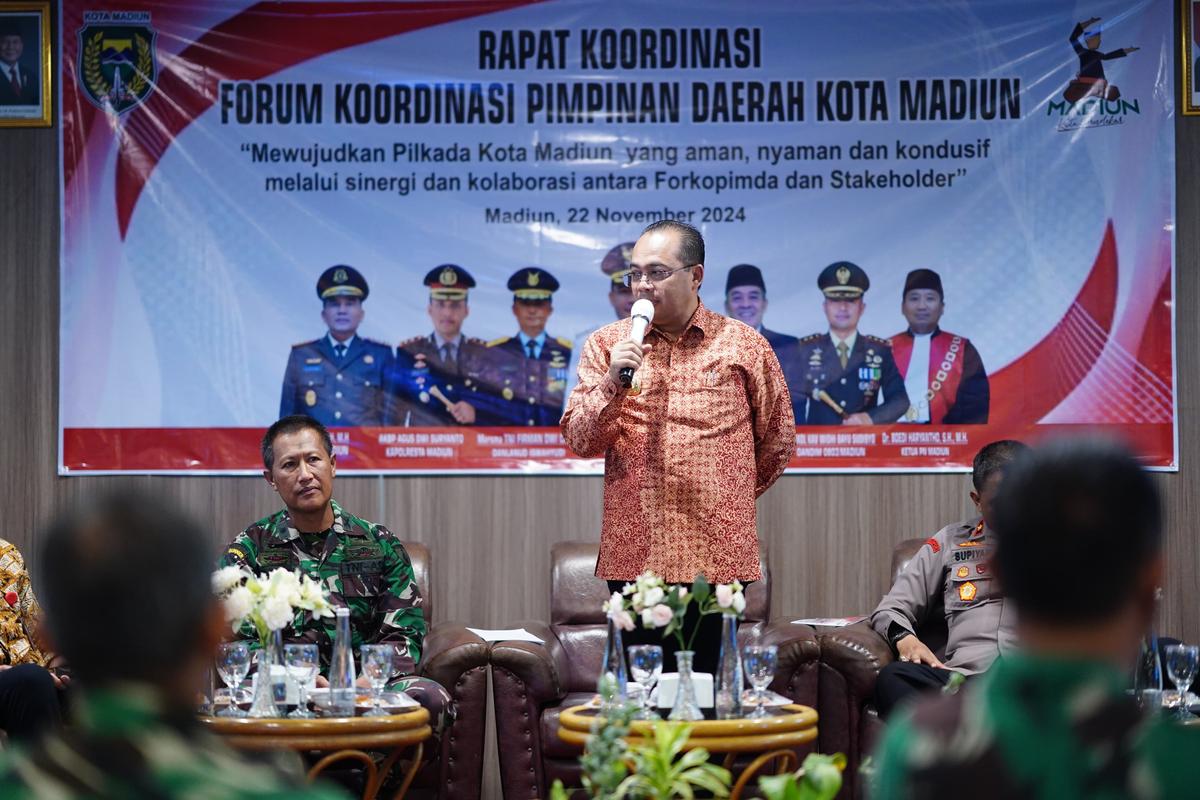 MADIUN - Pelaksanaan Pemilihan Kepala Daerah (Pilkada) Serentak 2024 tinggal lima hari lagi. Untuk itu, Pj Wali Kota Madiun Eddy Supriyanto menggelar rapat koordinasi bersama Forkopimda sebagai upaya menyamakan komitmen dalam mendukung pesta demokrasi berjalan aman, lancar, dan kondusif.