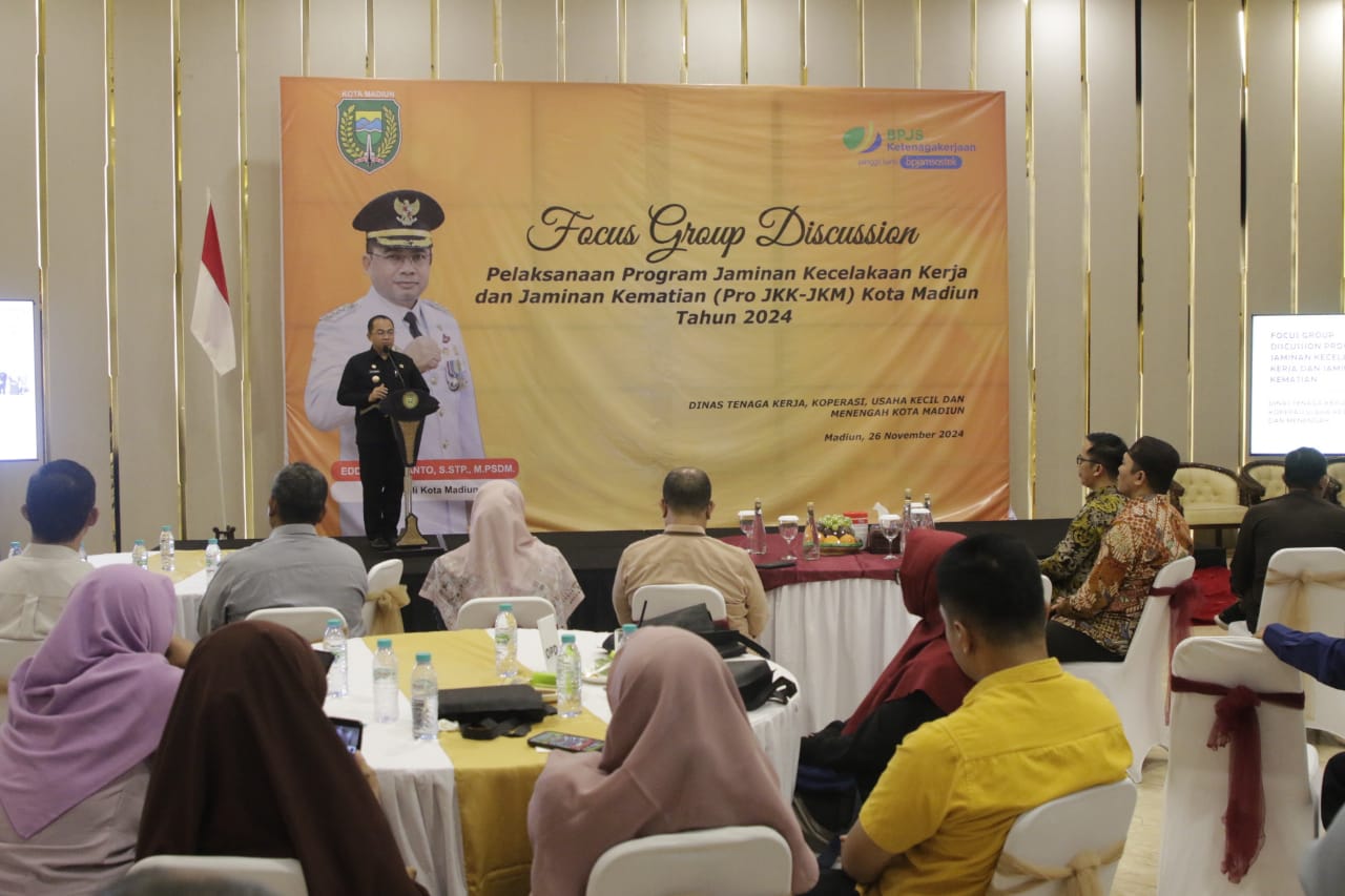 ‘’FGG ini yang pertama kita salurkan santunan dari manfaat pro JKK-JKM kepada ahli waris peserta dan yang kedua kita mengajak semuanya termasuk DPRD Kota Madiun dalam hal ini Komisi III untuk mengoptimalkan program ini,’’ kata Pj Wali Kota Madiun, Eddy Supriyanto usai membuka FGD yang berlangsung di Nawasewa Resto, Selasa (26/11).