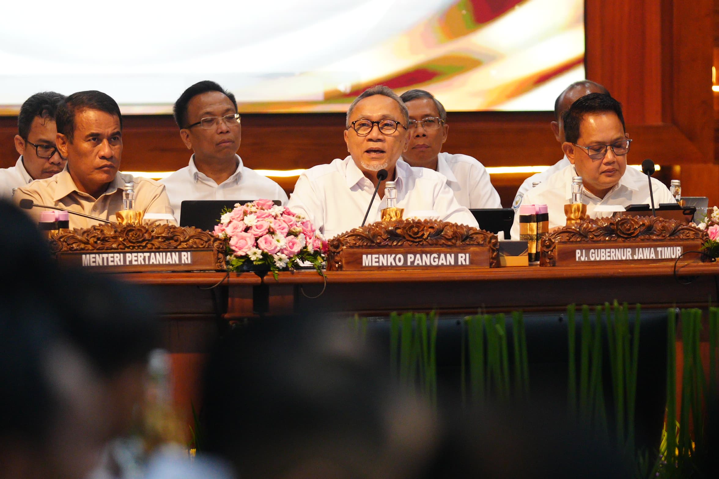 SURABAYA - Pj Wali Kota Eddy Supriyanto menghadiri rapat koordinasi terbatas bidang pangan Provinsi Jawa Timur yang dipimpin langsung oleh Menko Pangan RI, Zulkifli Hasan.