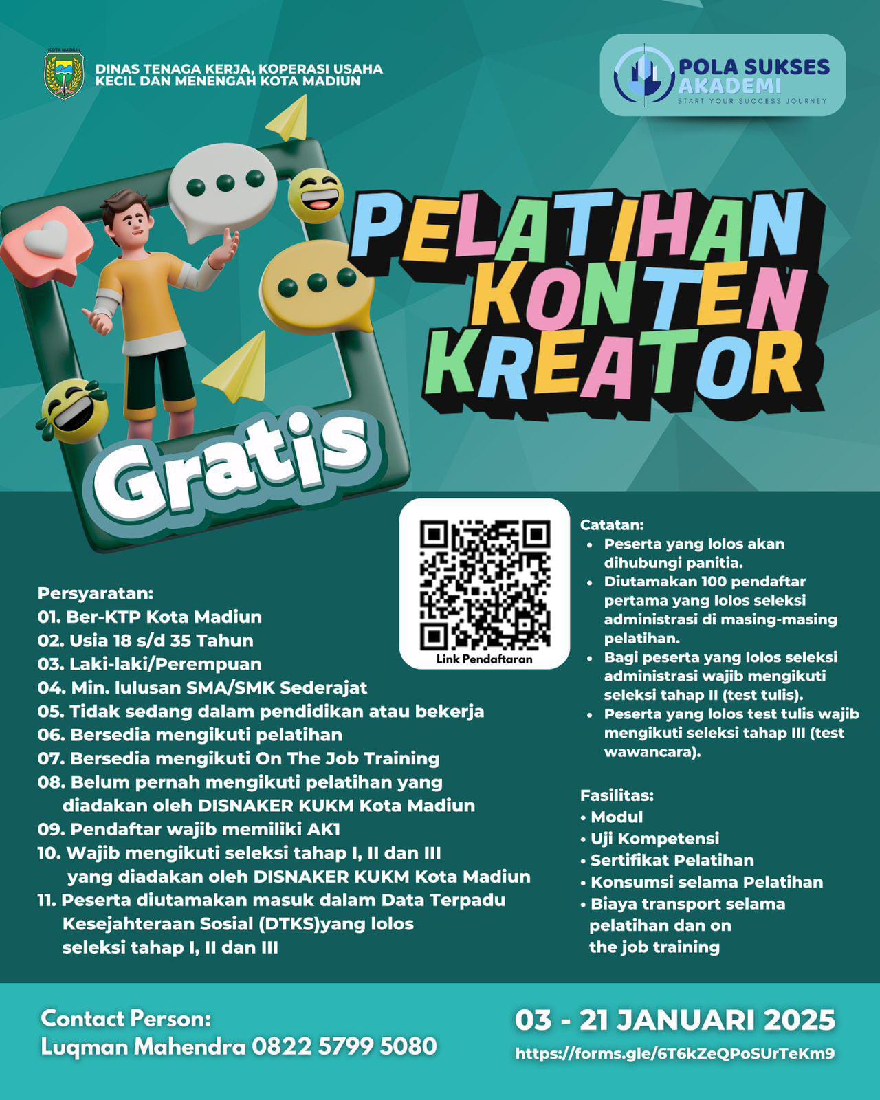 MADIUN - Pelatihan konten kreator yang disediakan Dinas Tenaga Kerja, Koperasi, Usaha Kecil, dan Menengah Kota Madiun tahun ini rupanya cukup diminati masyarakat. Hingga hari ini, pendaftar sudah mencapai 40 orang.