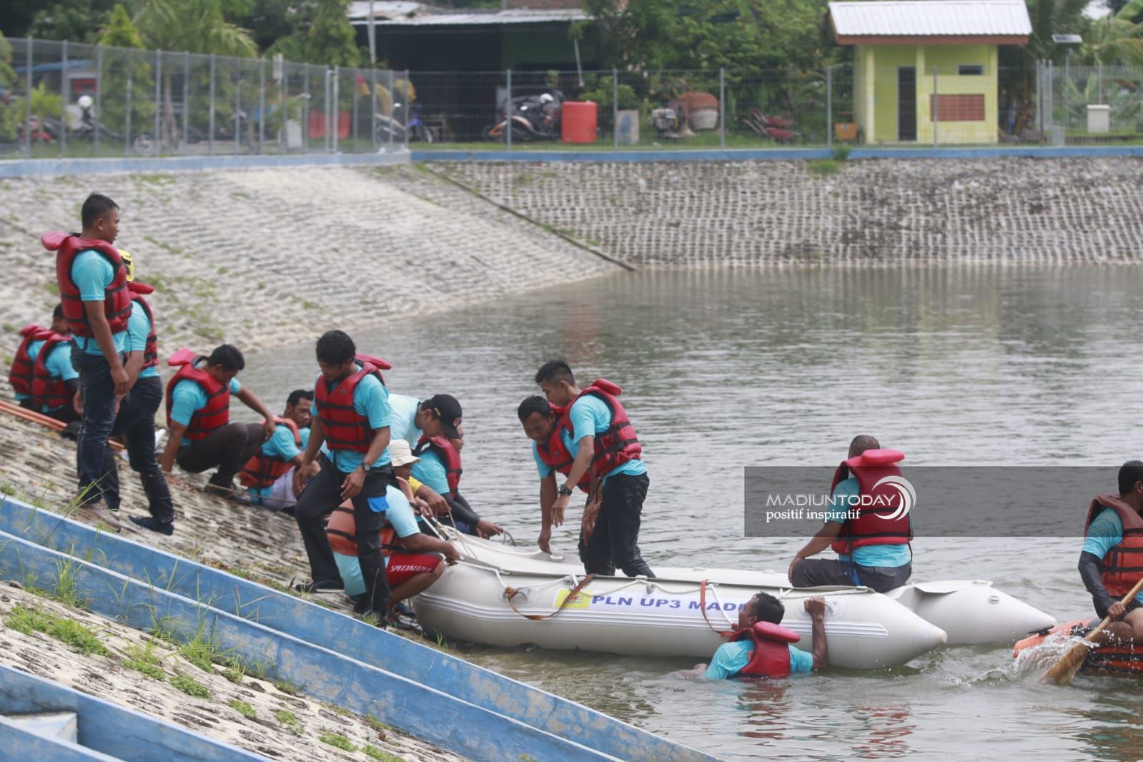 Seperti yang terlihat di Embung Pilangbango, Selasa (4/2). Sejumlah personil BPBD Kota Madiun bersama PLN UP3 Madiun melakukan simulasi tanggap darurat banjir di Embung Pilangbango.