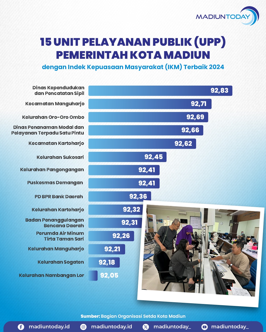 Tanti menyebut nilai terendah untuk 70 UPP di Kota Madiun di angka 81. Sedang, nilai tertinggi untuk 2024 di angka 92,83 yang diraih Dinas Kependudukan dan Pencatatan Sipil. Tertinggi kedua ada Kecamatan Manguharjo dan ketiga ada Kelurahan Oro-Oro Ombo. 15 UPP dengan nilai terbaik ada di dalam infografis. (oks/agi/madiuntoday)