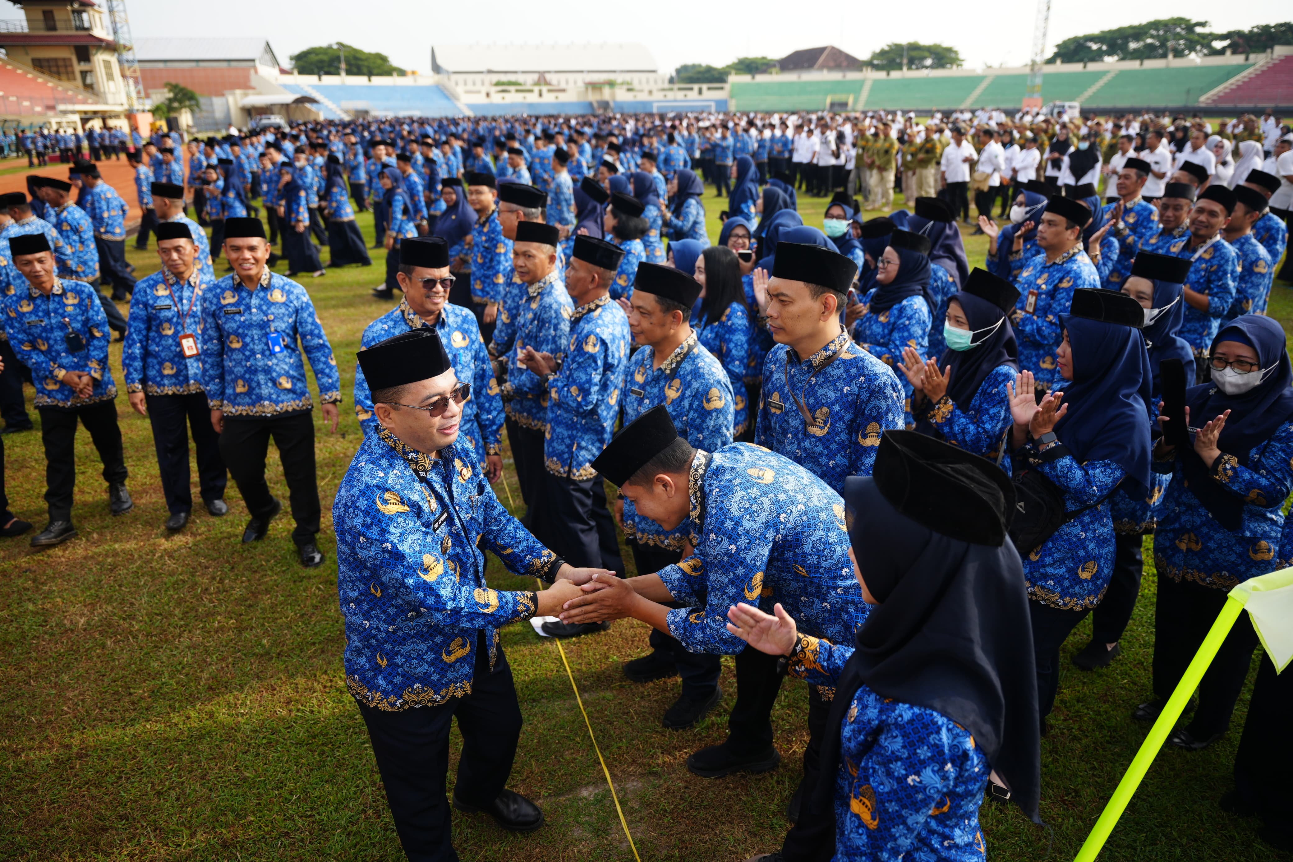 MADIUN - Pemerintah Kota Madiun menggelar apel besar pegawai di Stadion Wilis Kota Madiun, Senin (17/2). Dalam kegiatan yang dihadiri oleh seluruh ASN dan Non ASN Pemkot Madiun itu, Pj Wali Kota Madiun Eddy Supriyanto memimpin apel sekaligus berpamitan kepada peserta apel.