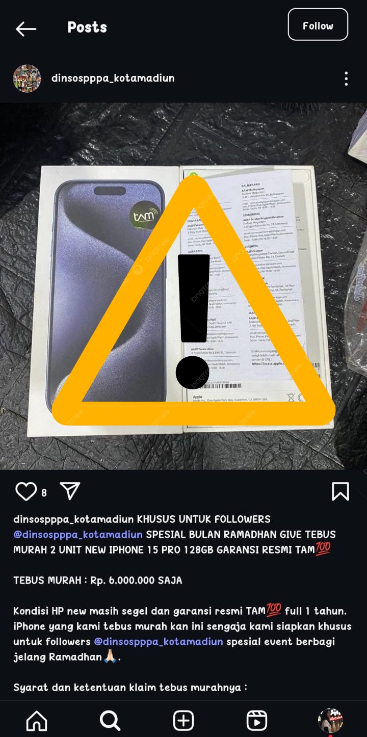 "Kami harap masyarakat tetap waspada dan tidak tergoda iming-iming yang diberikan oknum tak bertanggung jawab melalui Instagram kami," tandasnya. (irs/madiuntoday)