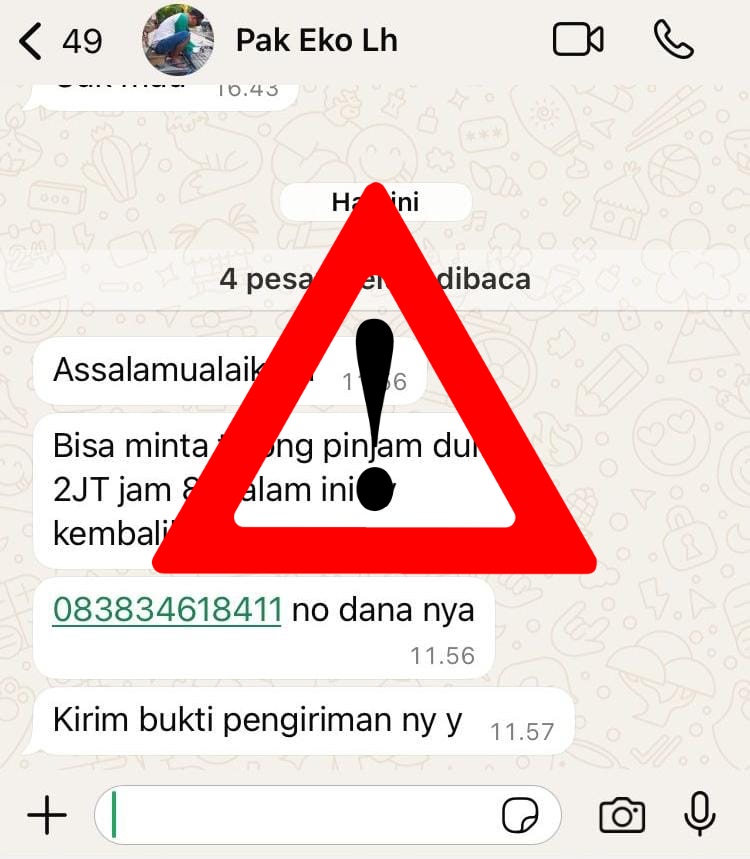 Dirinya baru sadar nomornya di-hack setelah sampai di rumah. Saat memeriksa WA, sudah ada banyak pesan yang dia kirim ke kontak yang ada di WA-nya. Isinya sama, meminjam uang. Bahkan, ada yang masih dalam proses mengetik saat dia buka. Kejadian itu sempat membuatnya panik. Eko lantas memeriksa menu setting dan keluar dari semua perangkat tertaut.