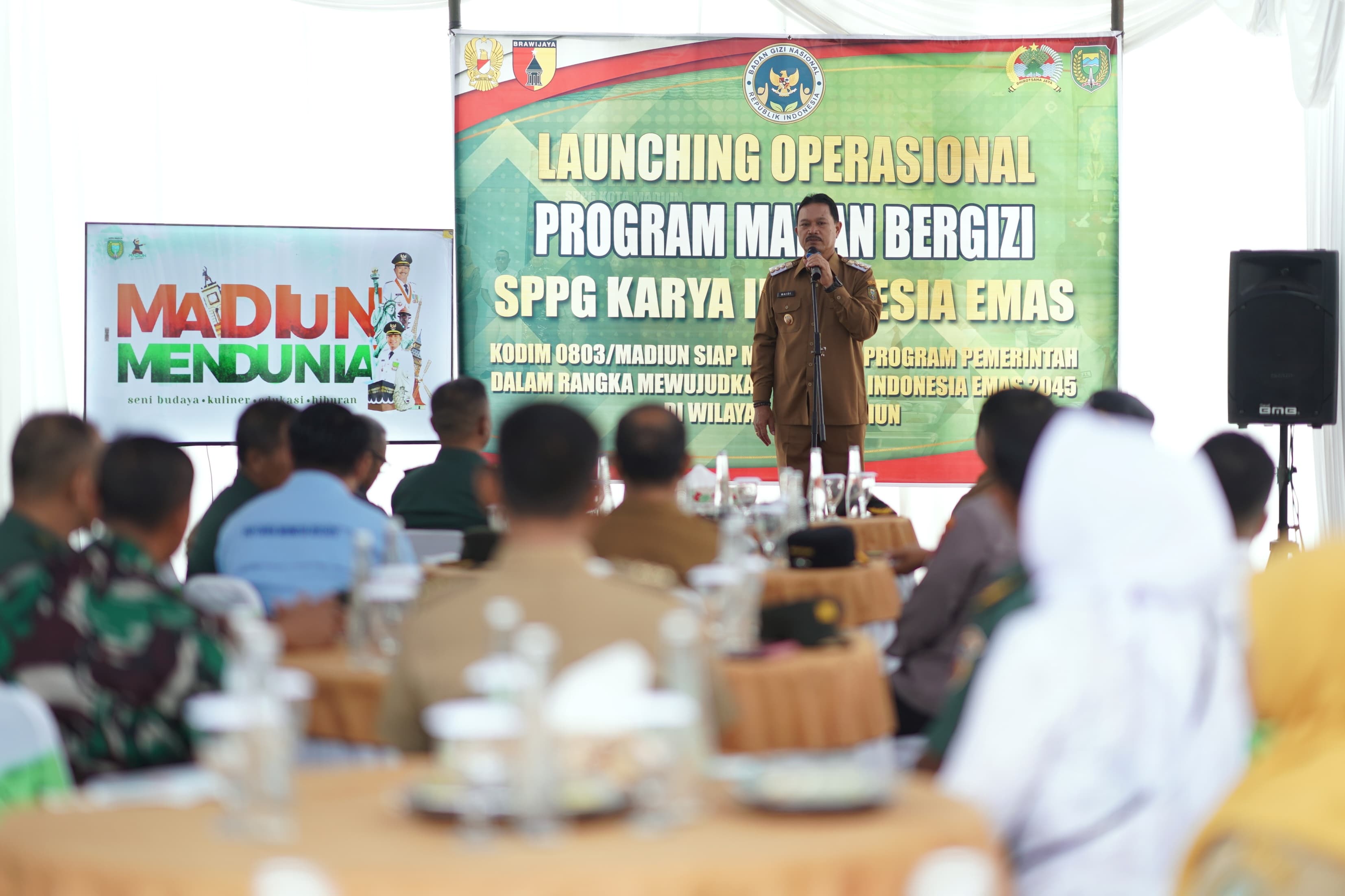 Senin (14/4), Wali Kota Madiun Dr. Maidi bersama Dandim 0803 Madiun Letkol Kav. Widhi Bayu Sudibyo, Ketua Yayasan Karya Indonesia Emas Dimpos Simamora, dan pimpinan OPD Pemkot Madiun hadir untuk meresmikan operasion dapur MBG tersebut.