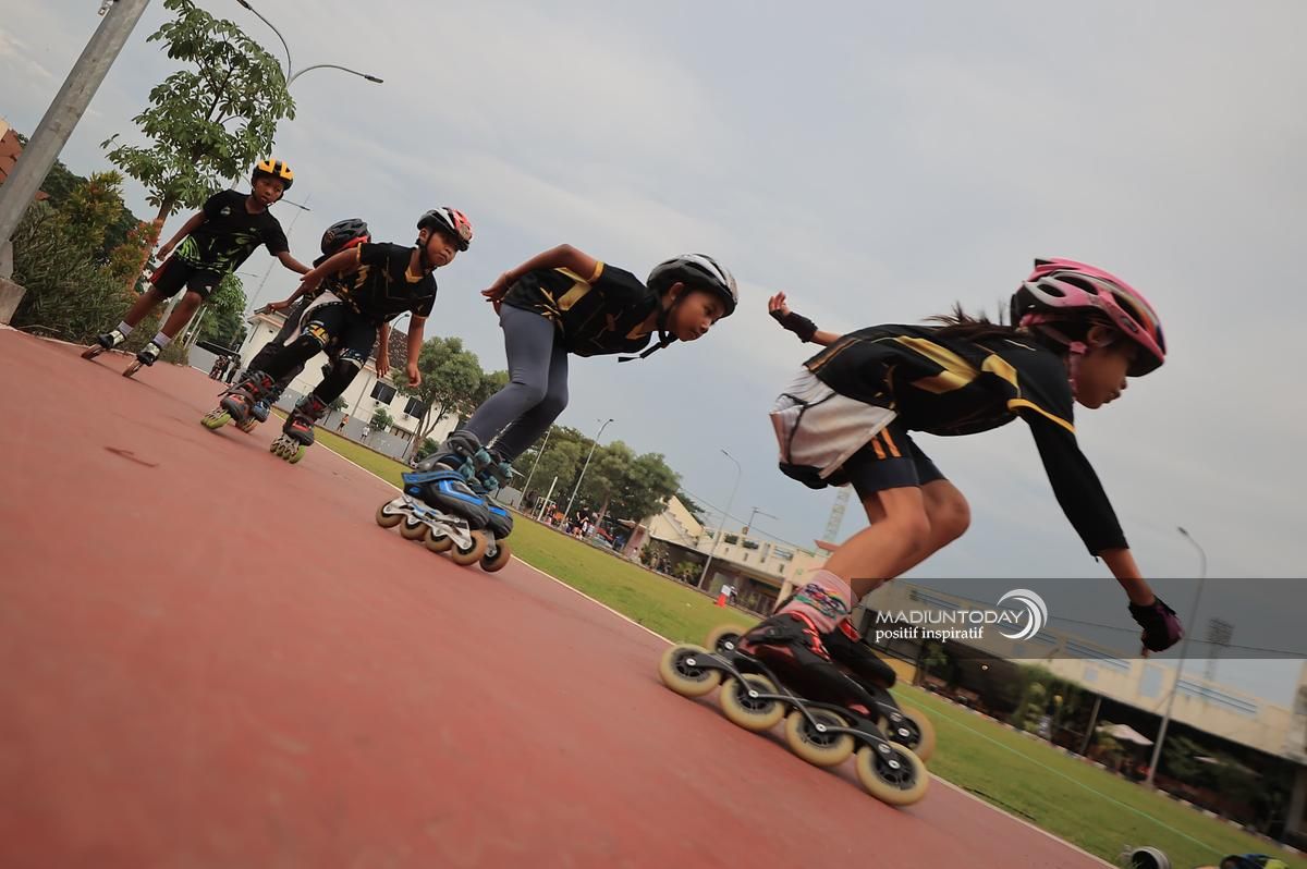 MADIUN - Suara roda yang beradu dengan aspal terdengar di sepanjang lintasan latihan, diselingi tawa riang anak-anak yang tengah berlatih sepatu roda. Di bawah pengawasan para pelatih, satu per satu peserta dengan seragam olahraga lengkap meluncur dengan percaya diri.