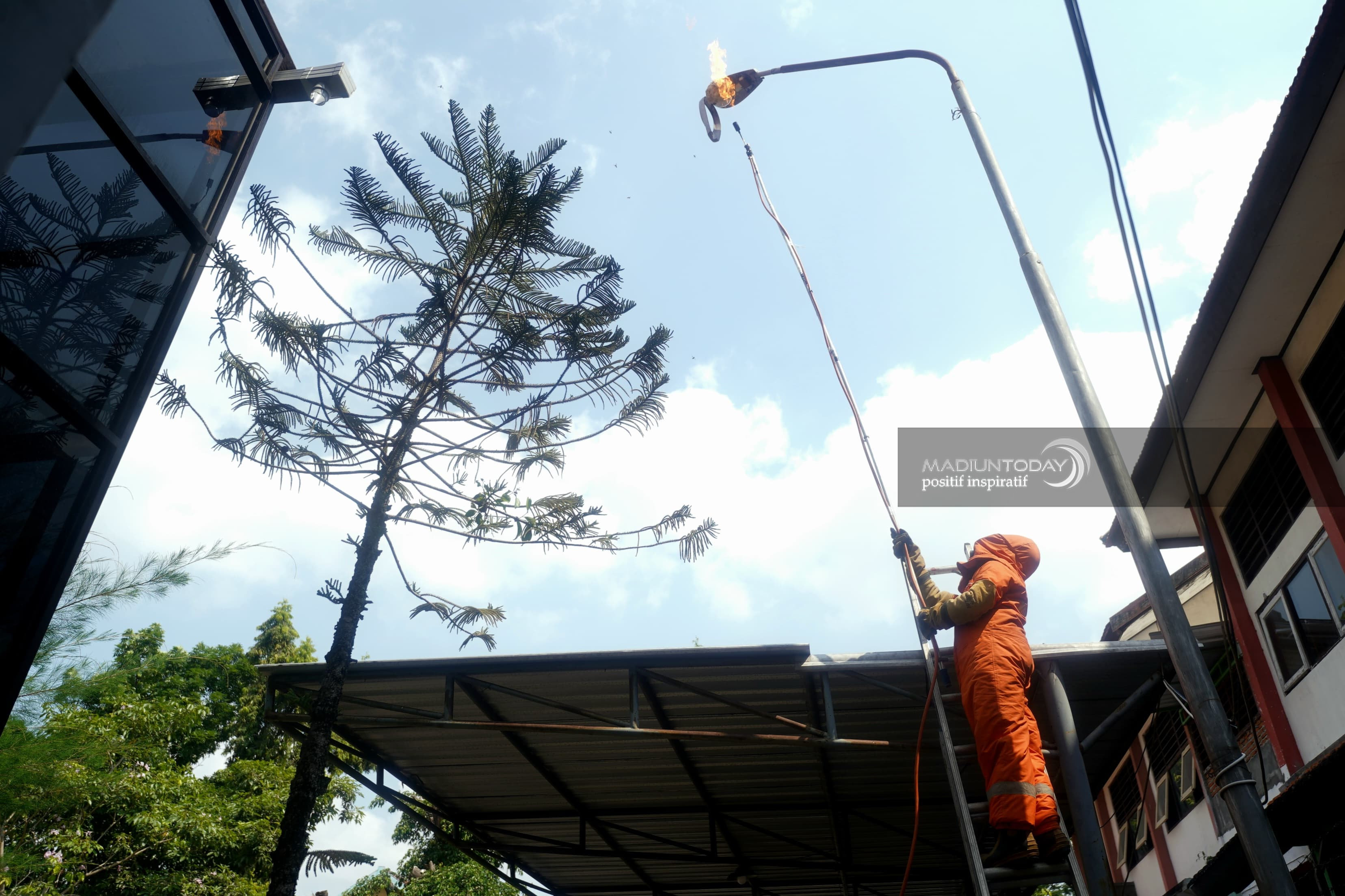 Sarang Tawon di Tiang PJU Gegerkan KPU Kota Madiun, Damkar Langsung Tindak Cepat