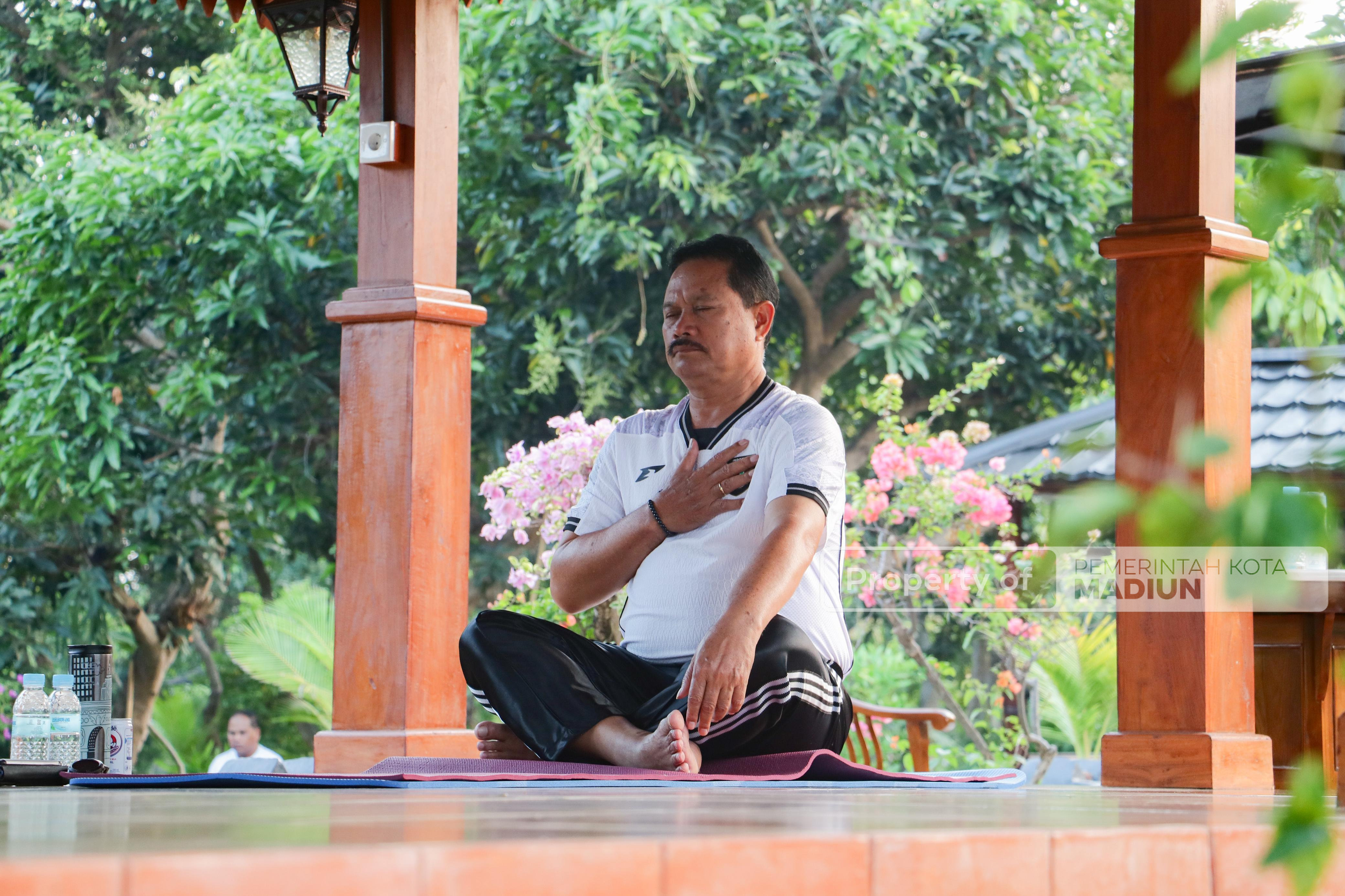 Orang nomor satu di Kota Madiun itu mengikuti sesi yoga bersama jajaran Organisasi Perangkat Daerah (OPD) di Guest House Ngrowo Bening.