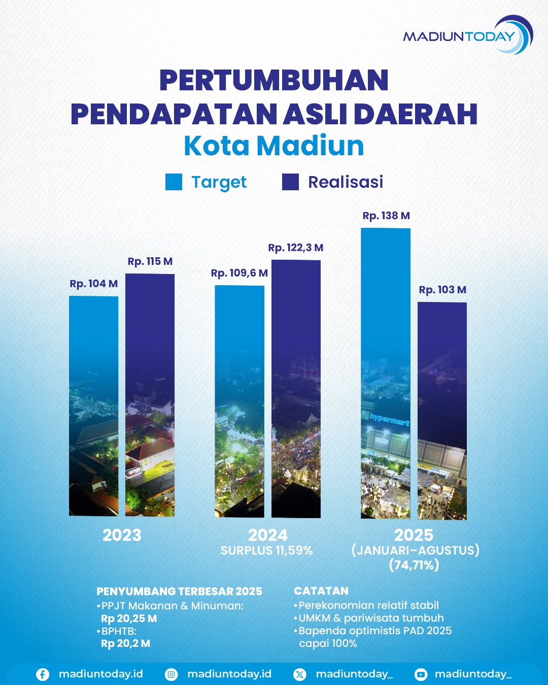 Sebagai perbandingan, PAD Kota Madiun pada 2023 tercatat Rp 115 miliar dari target Rp 104 miliar. Sementara pada 2024, realisasi PAD berhasil menembus Rp 122,3 miliar atau surplus 11,59 persen dari target Rp 109,6 miliar.
