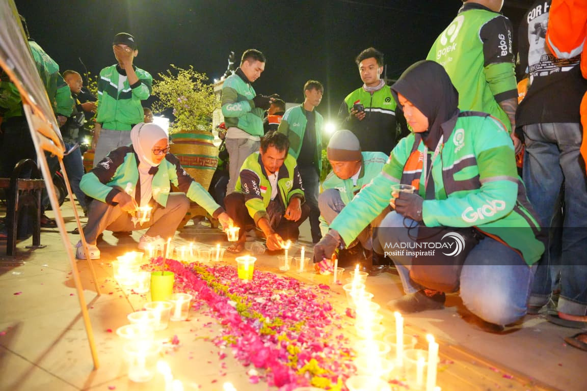MADIUN – Ratusan driver ojek online (ojol) menggelar aksi solidaritas di simpang lima Tugu Pendekar, Jumat malam (29/8). Tak lain, untuk mengenang almarhum Affan Kurniawan yang meninggal dunia akibat peristiwa kericuhan unjuk rasa di Jakarta belum lama ini.